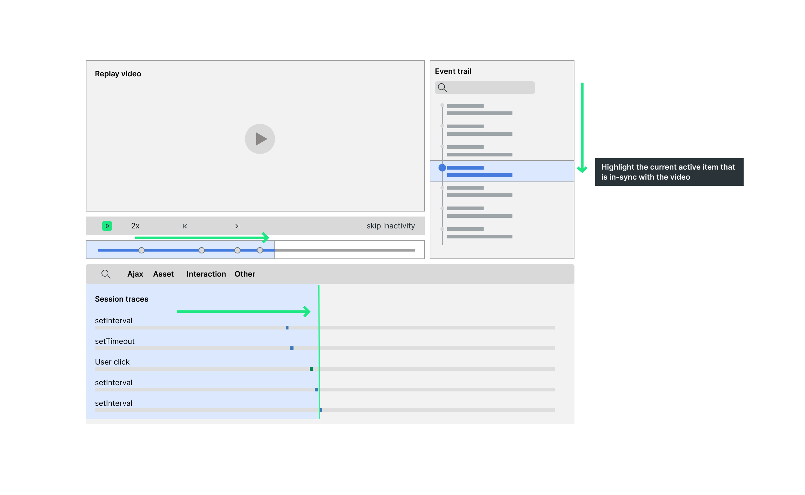 When a developer is deep in a "debugging flow," the biggest productivity killer is context switching—jumping between tabs to match a timestamp in a video to a specific line in a log file. To solve this, I focused on creating a unified view where the replay player, event trail, and session traces all move together in real-time.