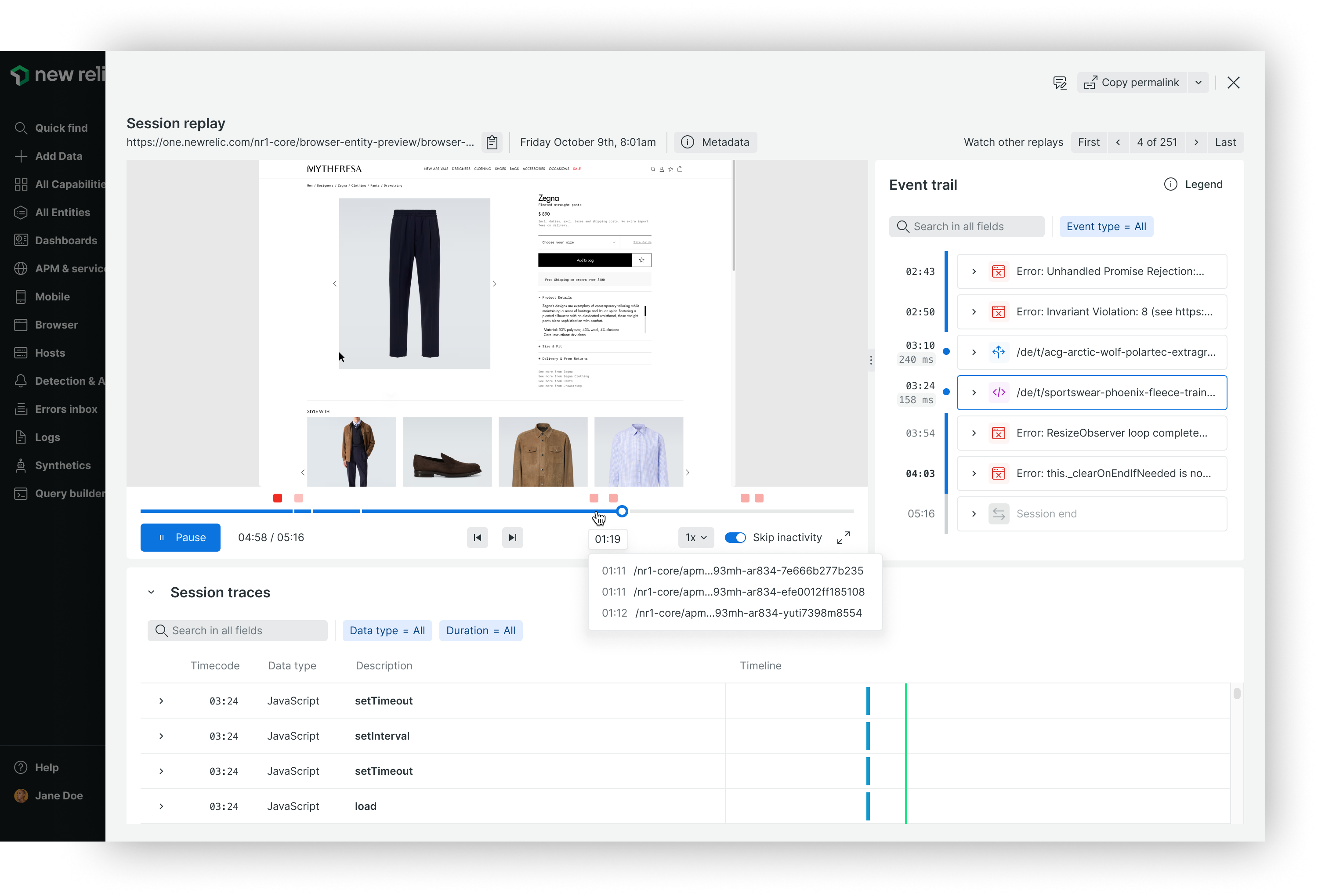 When front end developers troubleshoot issues, they need to know both wthe user was doing and how the application was responding when the issue occurred so they can gauge severity, reproduce errors, and identify root causes. Previously, New Relic offered only data-centric logs and traces, requiring developers to translate lengthy text into an approximation of what the user was doing.
