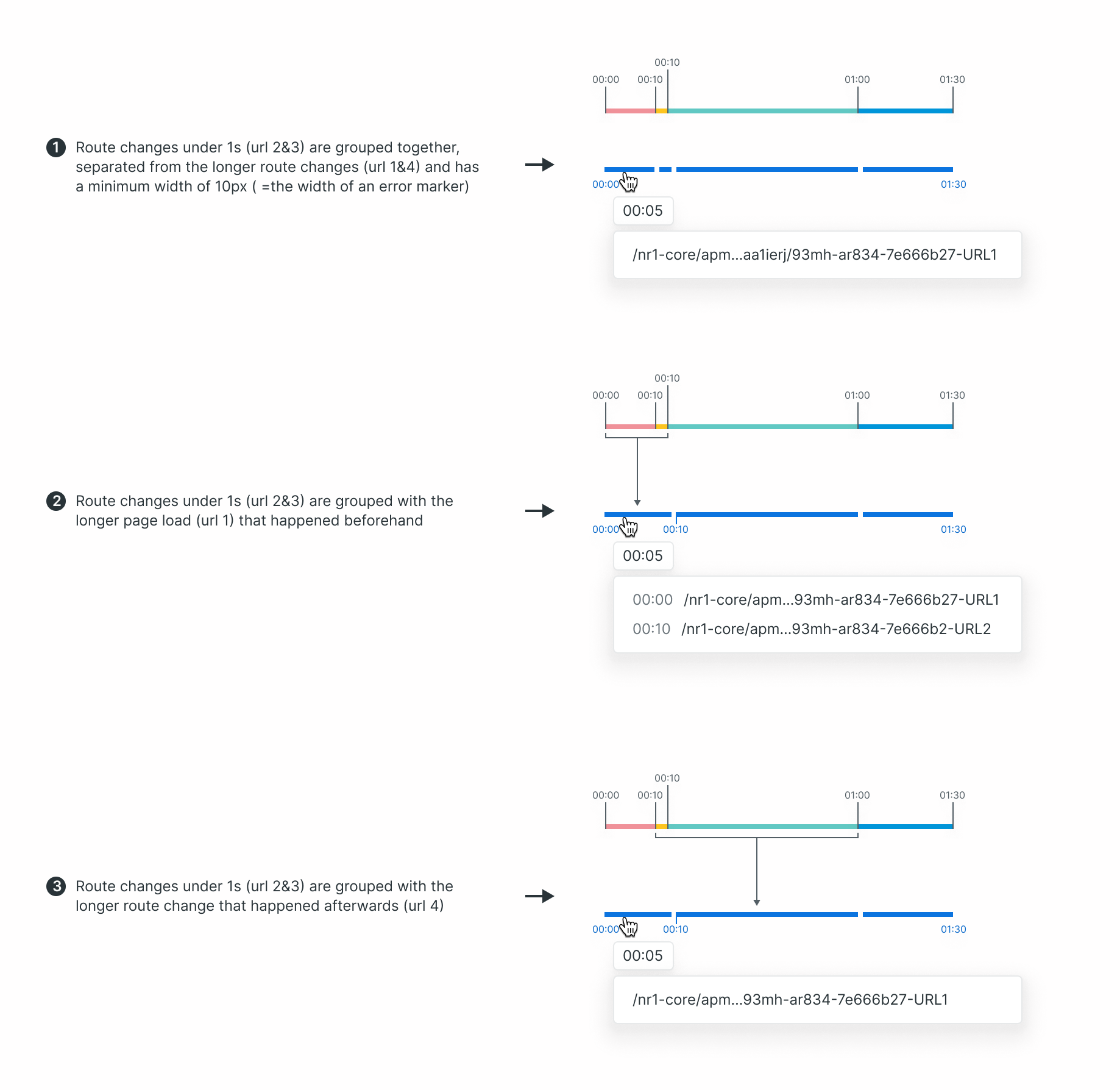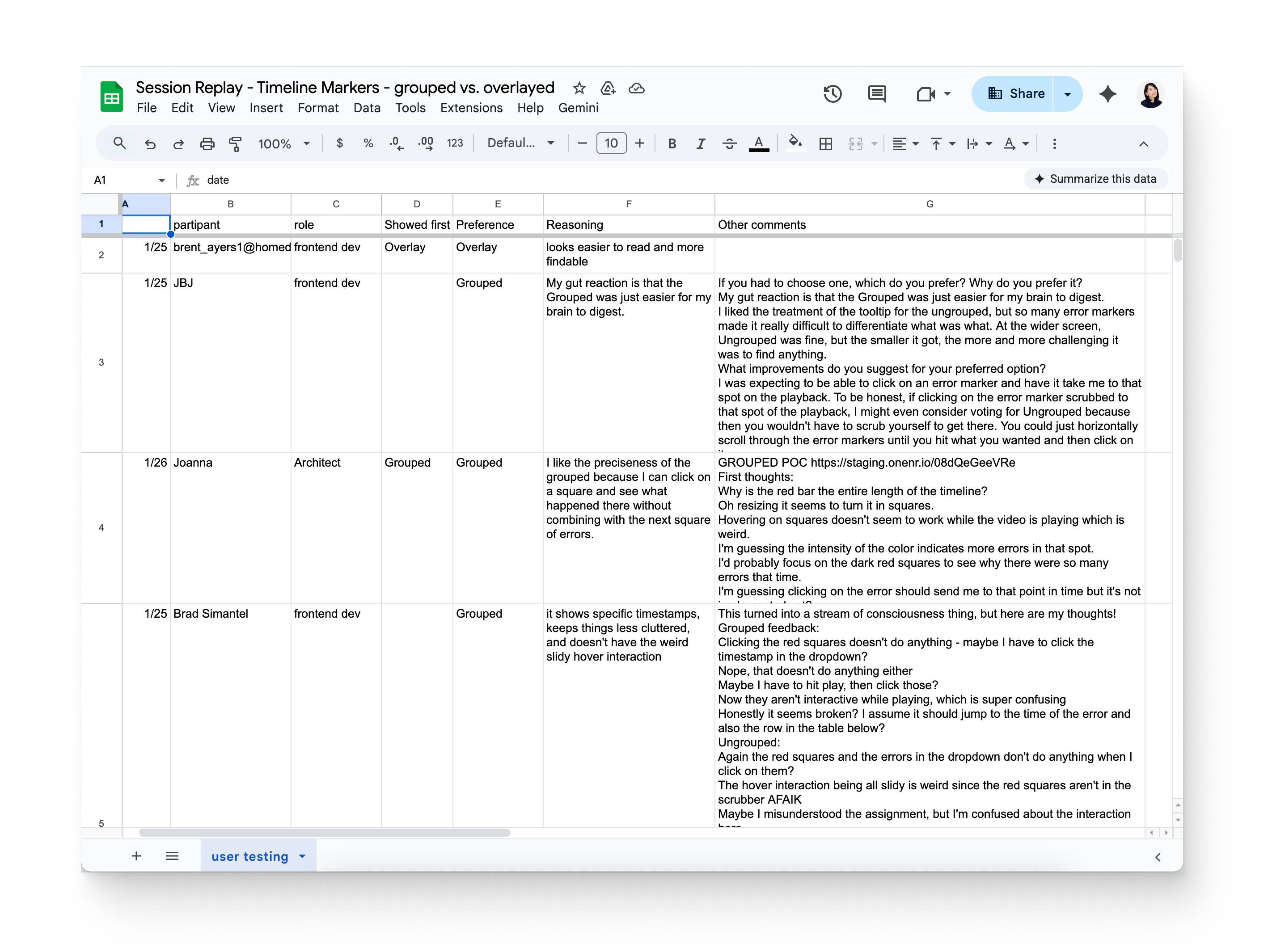 I conducted an internal user test to validate this ‘grouped’ approach against the ‘overlay’ (no-grouping) approach on the session replay timeline. My goal was to determine which pattern best helps users maintain an "eagle-eye" view of session when in small space.