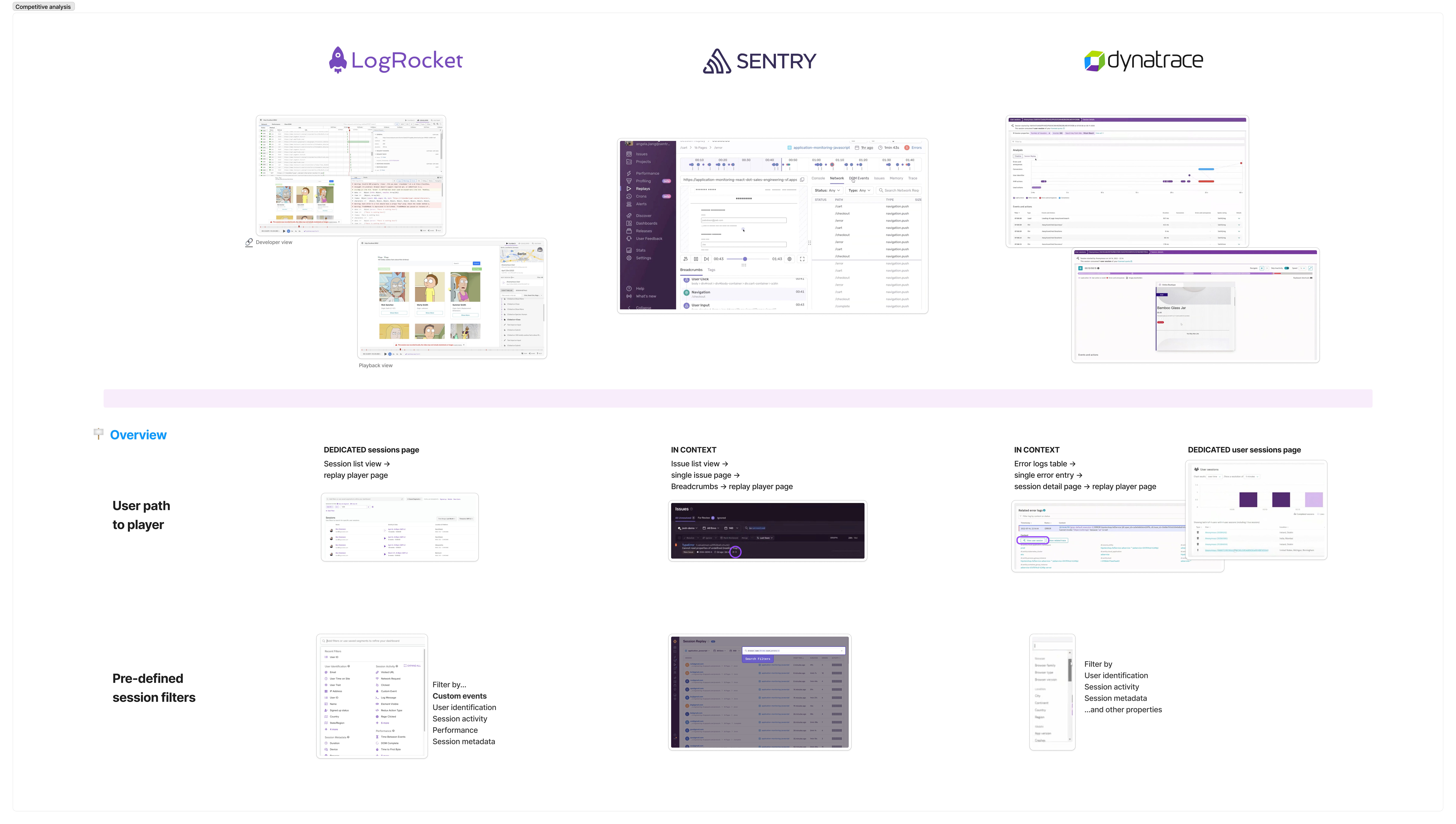 Before I start, I need to understand what customers are expecting from a session replay tool. I conducted a competitive analysis of session replay features, mapping out the functional landscape and identifying opportunities for differentiation.