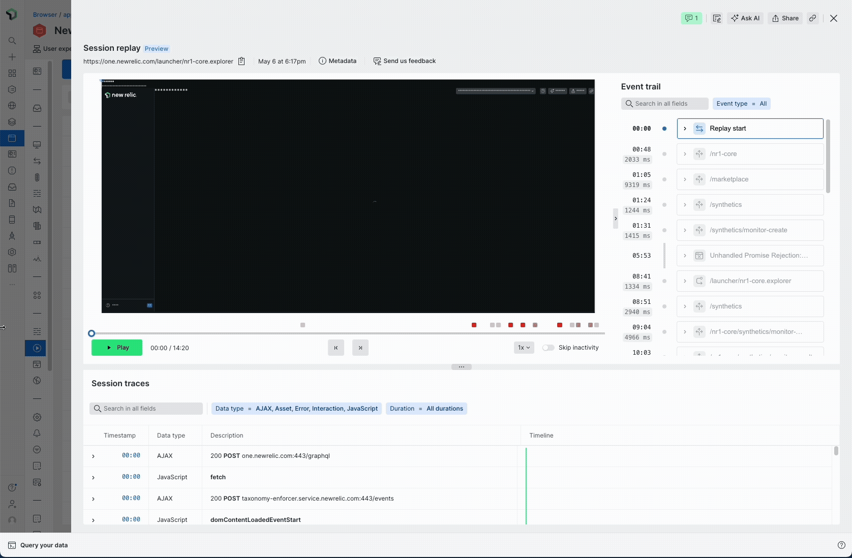 Session Replay is our number one requested feature from current and prospective customers. It provides visual context of what the end user was doing alongside the telemetry data of how the application was behaving. Session Replay also expands New Relic’s capabilities from traditional app monitoring to Digital Experience Monitoring (DEM).